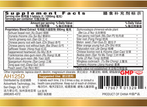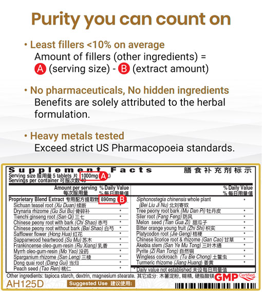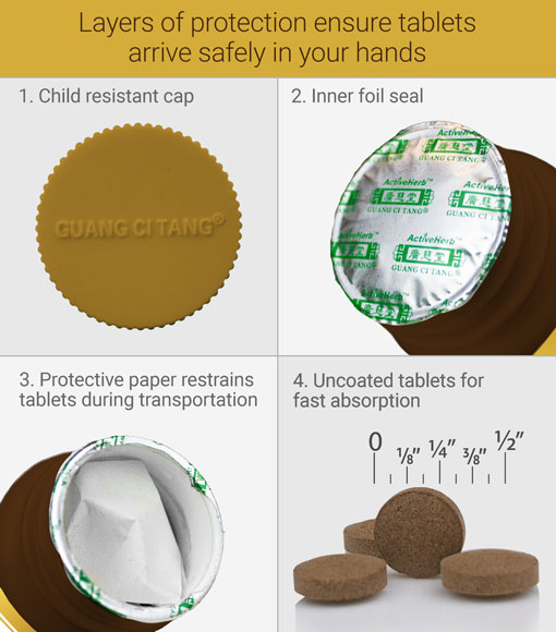 Jin Gu Die Da Pian tablets are made with 100% natural herbs that are tested for authenticity, quality, and potency. A traditional water decoction is prepared with the herbs to reproduce the time-tested efficacy of the formula, and this water decoction is concentrated with our proprietary technology to form a potent extract that is made into easily absorbed tablets, which are remarkably effective, easy to use, and safe. The tablets are produced by Guang Ci Tang® in our state of the art cGMP-certified facility and imported in accordance with U.S. FDA guidelines. When you choose Guang Ci Tang® products, you are taking advantage of a wonderful fusion of science and tradition that incorporates the highest standards in the field of Chinese medicine today.