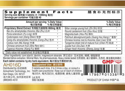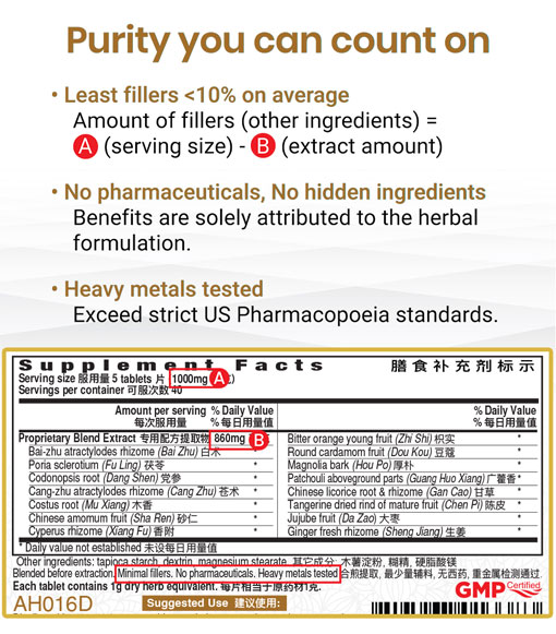 Xiang Sha Yang Wei Pian tablets are made with 100% natural herbs that are tested for authenticity, quality, and potency. A traditional water decoction is prepared with the herbs to reproduce the time-tested efficacy of the formula, and this water decoction is concentrated with our proprietary technology to form a potent extract that is made into easily absorbed tablets, which are remarkably effective, easy to use, and safe. The tablets are produced by Guang Ci Tang® in our state of the art cGMP-certified facility and imported in accordance with U.S. FDA guidelines. When you choose Guang Ci Tang® products, you are taking advantage of a wonderful fusion of science and tradition that incorporates the highest standards in the field of Chinese medicine today.