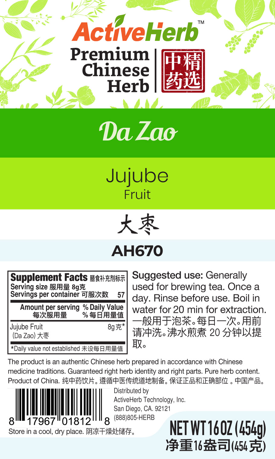 In TCM, Da Zao bulk herbs is used in the daily dosage of 6 to 15 g. In most cases, bulk herbs are cooked in boiling water to make tea or soup for consumption.