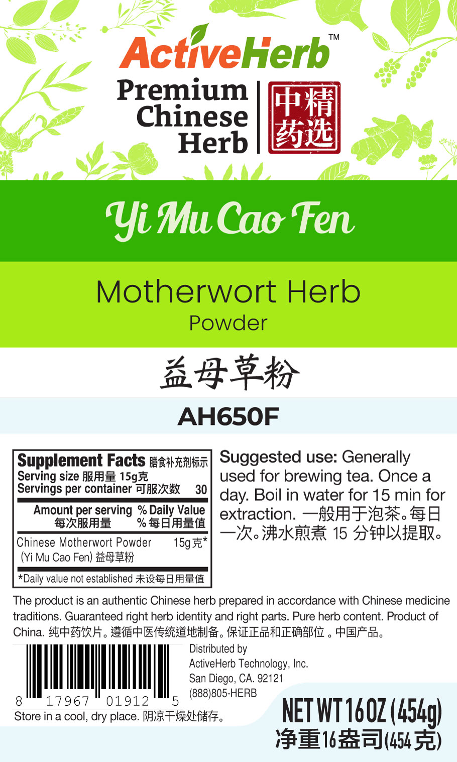 *Yi Mu Cao Fen bulk herb we sell is of premium quality. Our bulk Chinese herbs are mostly wild harvested but some herbs are farm grown to protect their natural habitats and meet increasing market demands. The harvests of right species at proper maturity are identified by experienced professionals, cleaned, cut or sliced, and dried. In many cases, special processing methods such as soaking with rice wine, steaming, roasting are applied as mandated by traditional Chinese medicine traditions to prepare the Chinese herbs to achieve desired properties, enhance efficacy, and reduce toxicity.