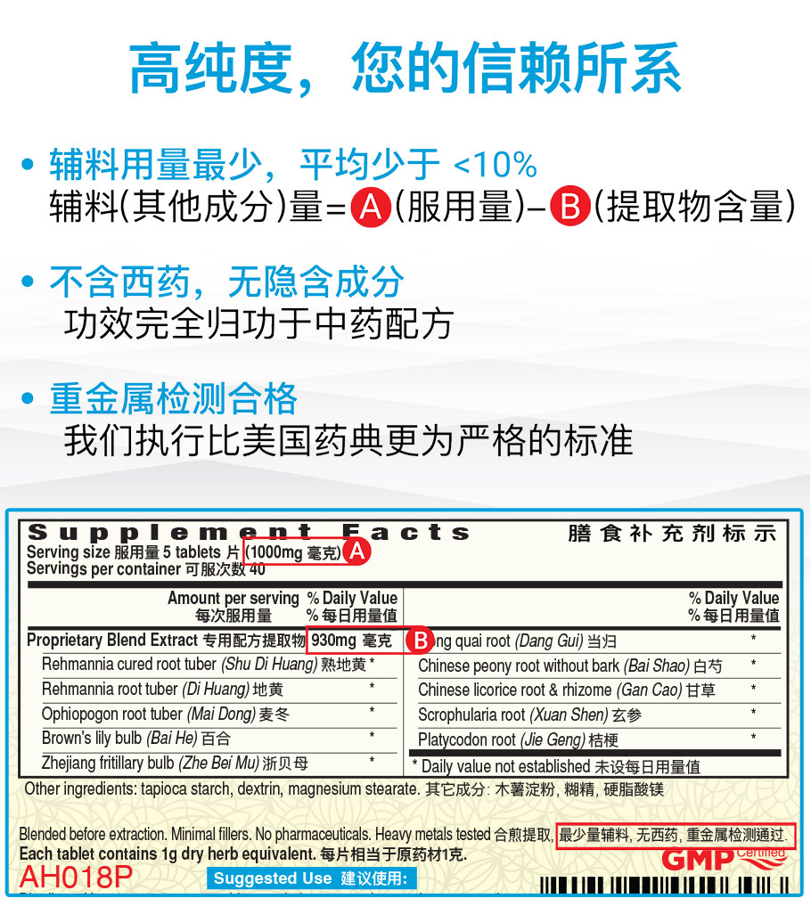 百合固金片 由100%纯天然中药制成。每味中药都经真品检定,质量上乘。传统水合煎翠取中药精华,专门工艺浓缩和压片。每一片都易于服用,易于吸收,功效显著而安全。广慈堂®所有片剂在我们先进的cGMP认证工厂生产,并根据美国FDA 指南进口。当您选择广慈堂®产品时,您选择的是科学与传统的完美融合,享受的是当今中医药领域的最高标准。