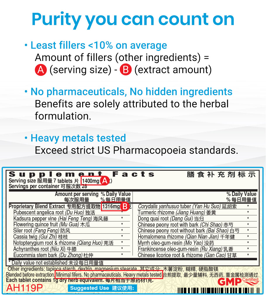 Feng Shi Xiao Tong Pian tablets are made with 100% natural herbs that are tested for authenticity, quality, and potency. A traditional water decoction is prepared with the herbs to reproduce the time-tested efficacy of the formula, and this water decoction is concentrated with our proprietary technology to form a potent extract that is made into easily absorbed tablets, which are remarkably effective, easy to use, and safe. The tablets are produced by Guang Ci Tang® in our state of the art cGMP-certified facility and imported in accordance with U.S. FDA guidelines. When you choose Guang Ci Tang® products, you are taking advantage of a wonderful fusion of science and tradition that incorporates the highest standards in the field of Chinese medicine today.